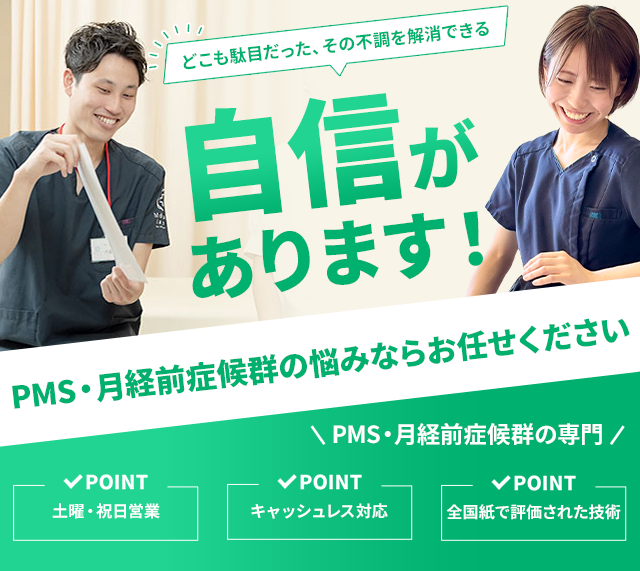 骨盤や背骨を矯正することで自律神経・子宮、卵巣を整えた上で、筋肉の調整を行うことで、辛いPMSの症状を改善に導くことができるのです。