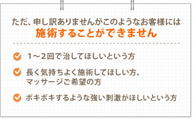 A.はい、バキバキ・ボキボキしないソフトな整体ですのでご安心ください。