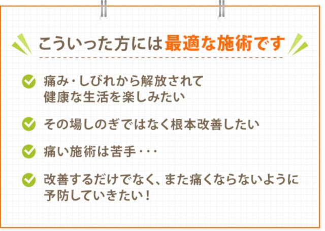 痛みのないソフトな整体で、不調の根本的な原因から改善に導きますので、整体が初めての方でも安心してお受けいただけます。